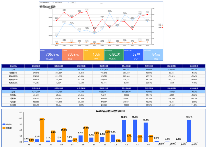 2、商品结构管理:各零售药店每月商品销售情况,包括品单价、品项占比、销售占比、价格带、双ABC、品类效益、理论与实际、关联率、微定价等等。