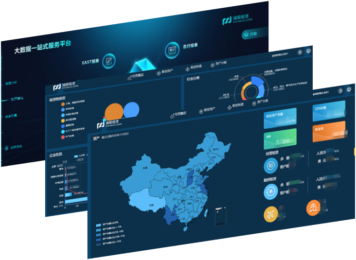 浦银租赁大数据服务平台一共建设了183张报表,涵盖日常工作报表、财务报表、监管报送、1104报表、人行报表、总行报表、EAST报表等,满足公司领导、资产部门、财务部等各部门人员多样化的数据分析需求。帮助高管快速掌握公司的运营情况,精细化管理;让业务人员自助拖拽报表,释放实施人员精力,为业务人员给予工作便利,提高工作效率;支持监管报表的填报、审核、上报、汇总等工作,满足监管报表的定时报送要求。