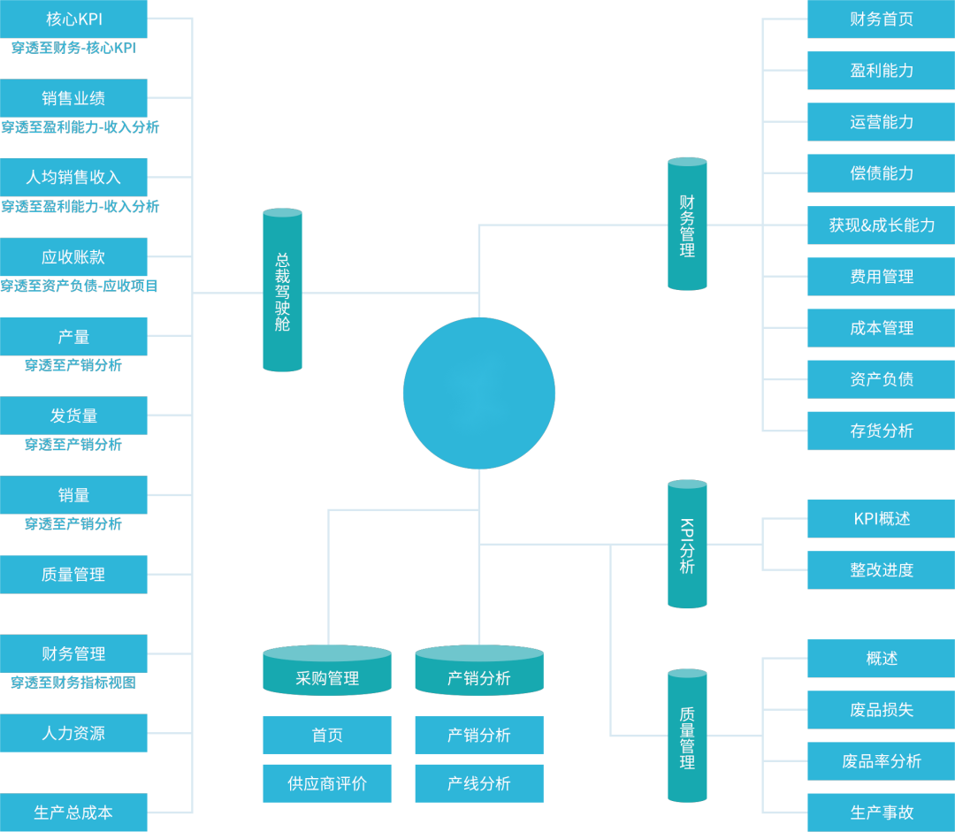 贯彻总体规划、分步实施的策略,一期贯彻公司数据信息化的方针,把数据信息作为重要的资产来经营,所有的经营数据要实现平台化管理,逐步取消员工个人数据表单的非协同数据管理方式,重点聚焦财务数据及财务分析,质量、交付、成本等管理重点方面的数据展示和分析报告,以及KPI绩效考核方面的分析数据的汇总,重点设计总经理分析决策看板等。