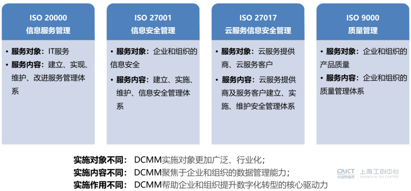 DCMM与ISO、CMMI相比,一是评估对象更加广泛和行业化;二是评估内容聚焦于企业和组织的数据管理能力;三是评估作用帮助企业和组织提升数字化转型的核心驱动力。