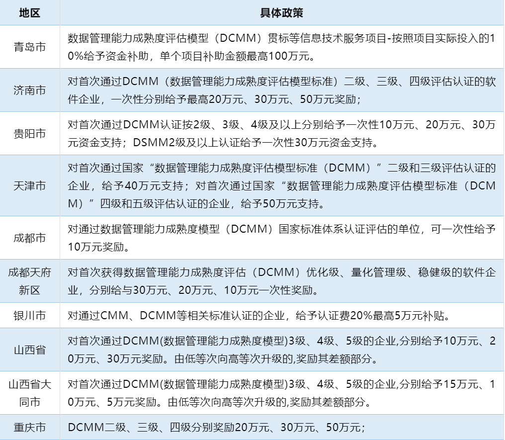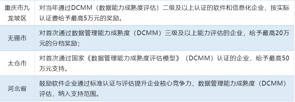 得补贴:国内多地都已针对DCMM贯标出台了相关的补贴政策。