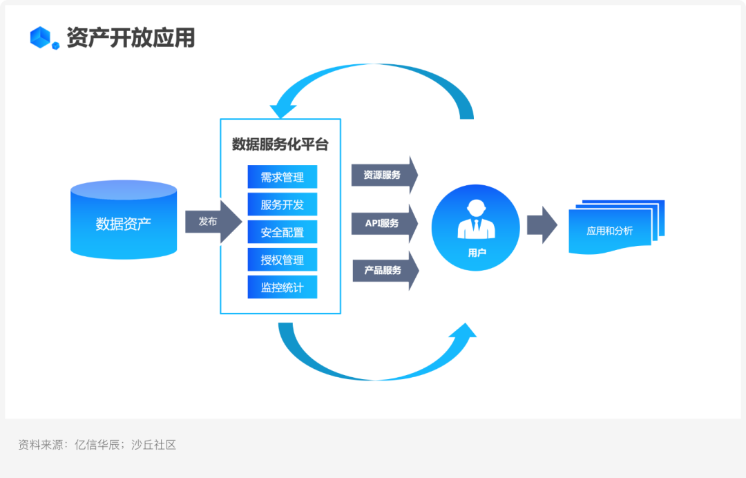 数据资产治理完成后将资产发布到开放平台上给予数据服务,例如需求管理、服务开发、安全配置、授权管理、监控统计等,实现资产价值。