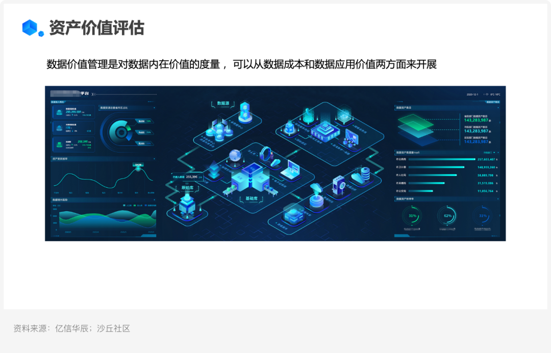 数据价值评估是对数据内在价值的度量,包括成本和应用价值两个层面。数据成本考虑的是数据丢失的重建成本、非结构化数据的存储成本等;应用价值主要顺利获得资产的使用情况进行衡量,包括指标、接口、主数据等。