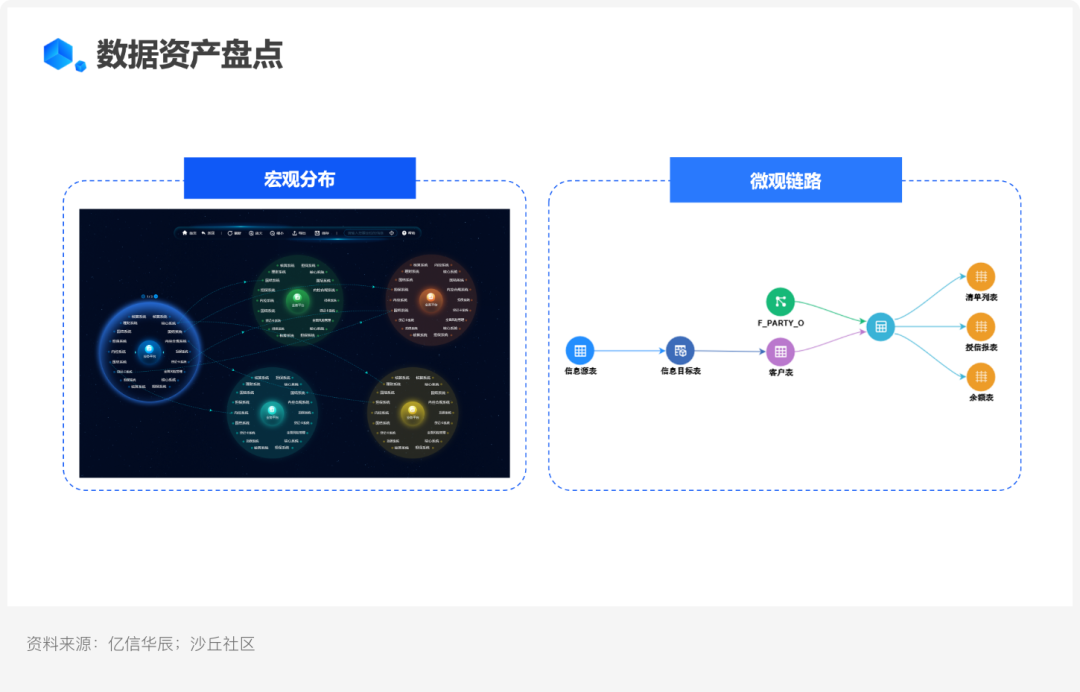 • 微观链路:数据资产的所有者需要分析资产的产生过程、管理者需要考虑如何将资产作用最大化,资产的消费者需要知道拿到的资产是否是其想要的数据,以上均需要微观链路进行反复核实。