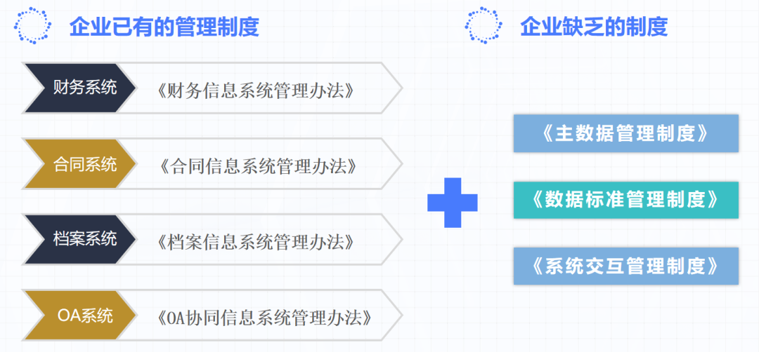 企业缺乏数据管理制度和标准,无法对数据进行有效管控;同时没有专门的数据管控组织和人员,数据归口职责部门不明确,造成数据质量差,数据录入、交互不及时。