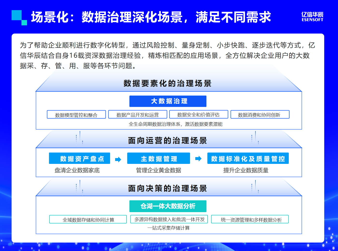 毛大群认为,场景化应该从上述3大方向找到对应突破口。基于此,Ebpay不断深化数据治理需求,给予面向数据要素化的治理场景、面向运营的治理场景、面向决策的治理场景的数据治理解决方案。