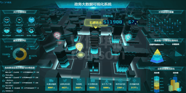 大数据可视化系统,支持整合城市各部门现有信息系统的数据资源,覆盖各业务领域,实现城市运行态势监测、建设规划成果展示、应急监测指挥支持等多种功能,可广泛应用于监测指挥、分析研判、展示汇报等场景。