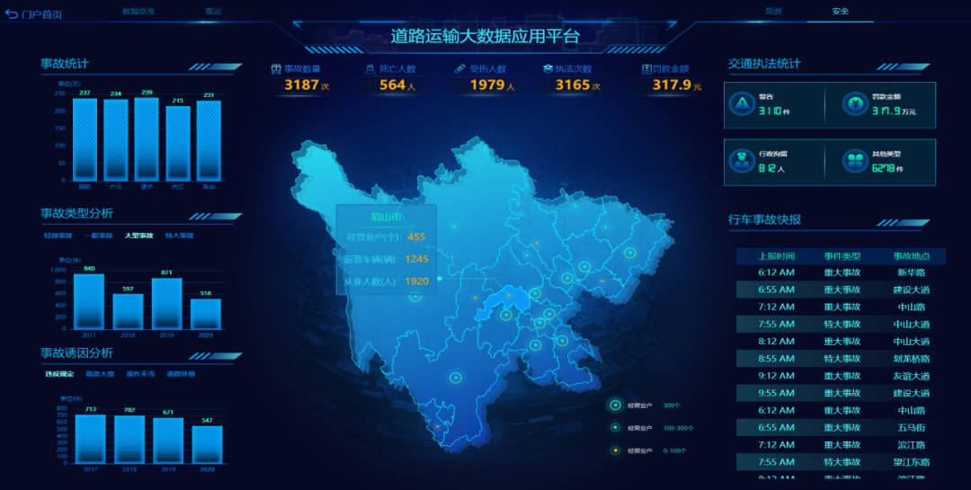 对于交通管理部门来说,利用可视化大屏能为交通管理指挥给予科学的决策支持。由于大屏集成地理信息系统、视频监控系统、交管部门各业务系统数据,对交通路况、警力分布、警情事件、接处警情况等要素进行综合监测,能够帮助管理者实时掌握交通整体运行态势。