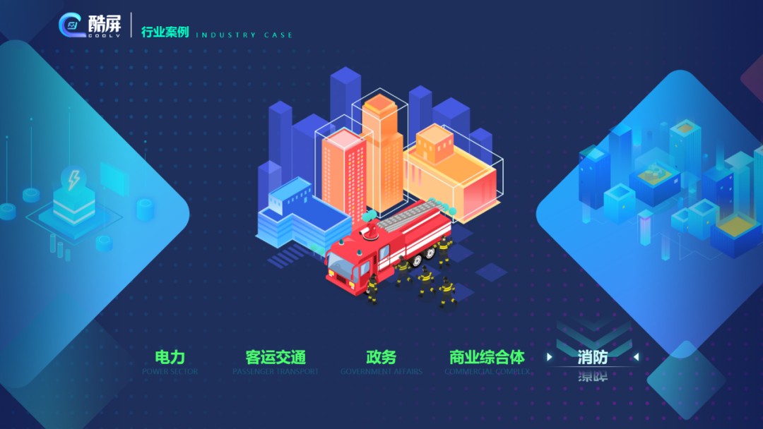 此DEMO囊括政务、电力、交通、商业、消防五大行业案例,点击行业可切换不同行业。
