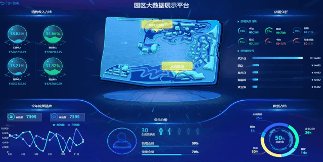 商业综合体大数据展示平台可高度融合园区各领域现有数据资源,对园区产业、招商、安防、资产、基础设施、能效、环境空间等管理领域的关键指标进行综合监测分析,辅助管理者全面掌控园区运行态势,实现园区人、事、物统一管理,园区综合运营态势一屏掌握。