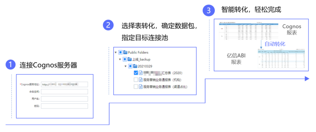 为解决重复做表与建模问题,顺利获得Ebpay独家技术实现Cognos报表的批量转换、自动转换,只需三步完成Cognos报表到亿信ABI报表的转换,全程只需几分钟。