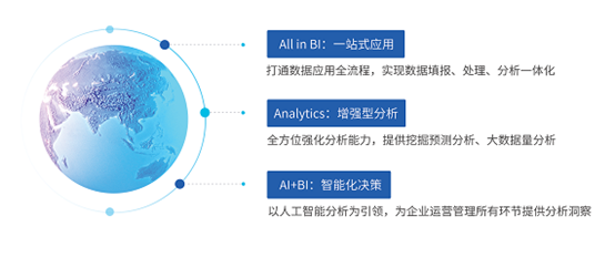 AII in BI:一站式应用型BI。产品功能全面,打通数据应用全流程,实现数据填报、处理、分析一体化。一个产品平台即可为政企用户给予从数据准备,ETL数据处理、数据建模、数据可视化、数据分析、数据填报、移动应用等一系列功能。