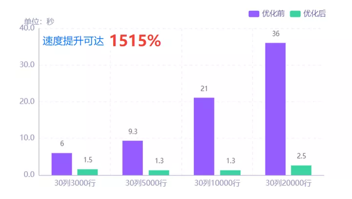 当我们在使用固定表分析、敏捷看板、即席报告功能时均能亲身体验到这一优化效果。我们模拟了用户场景,对不同的数据量进行了计算性能的对比测试,如下图所示: