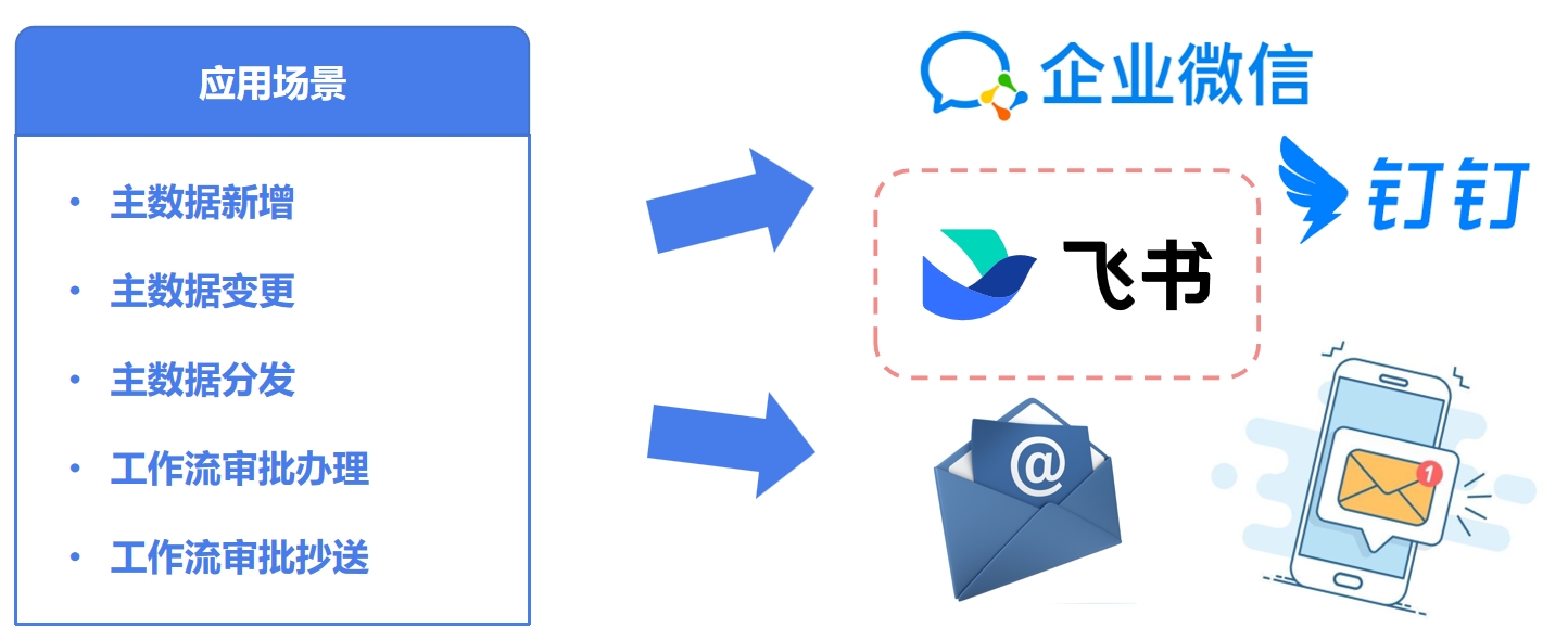 针对企业协同办公场景碎片化痛点,新版睿码主数据平台新增飞书应用集成能力,与既有支持的钉钉、企业微信形成完整生态矩阵。主数据流程中的各种通知都可以顺利获得飞书向企业内部员工通知,顺利获得界面化配置即可完成消息通知某互联网企业在供应商准入流程中,顺利获得飞书机器人自动推送审批消息,审批时效从平均8小时缩短至30分钟。
