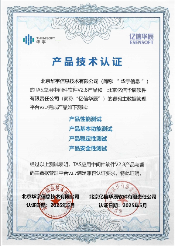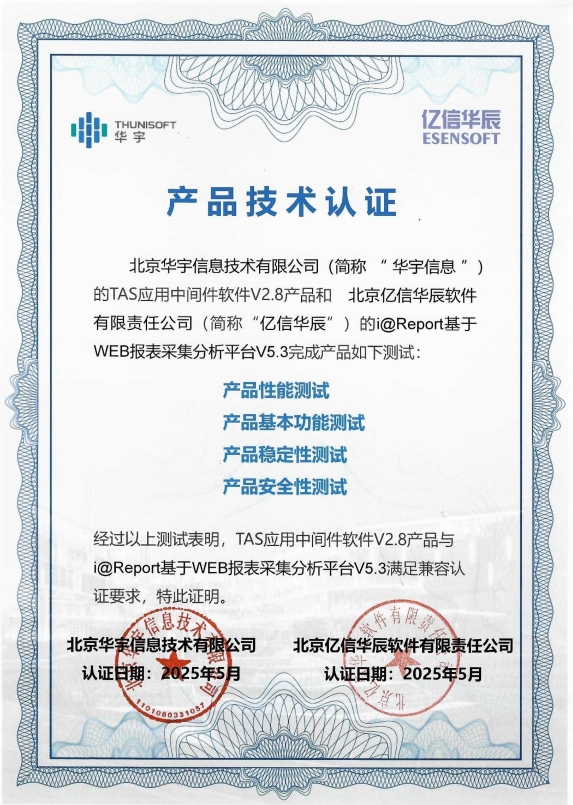 近期,EbpayABI、睿治、睿码、i@Report多款产品最新版本与华宇TAS应用中间件V2.8成功顺利获得兼容互认证测试,双方产品在功能协同、性能优化及高可用性等维度实现全面适配,将为用户给予更加稳定、高效、安全的国产化解决方案。
