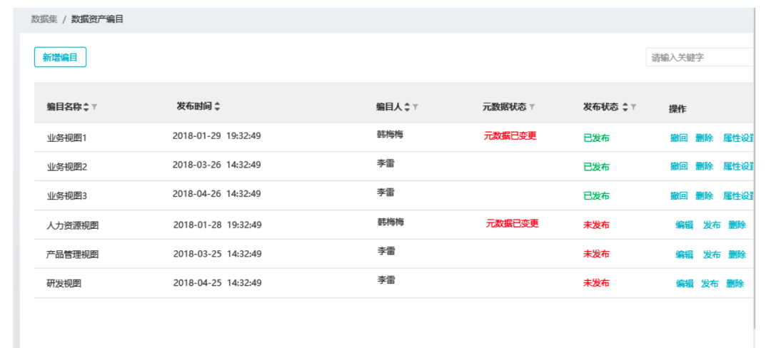 不同角色对所查看的资产视图需求也不同,因此平台给予不同视角的数据资产编目, 如技术视角、业务视角、管理视角等。
