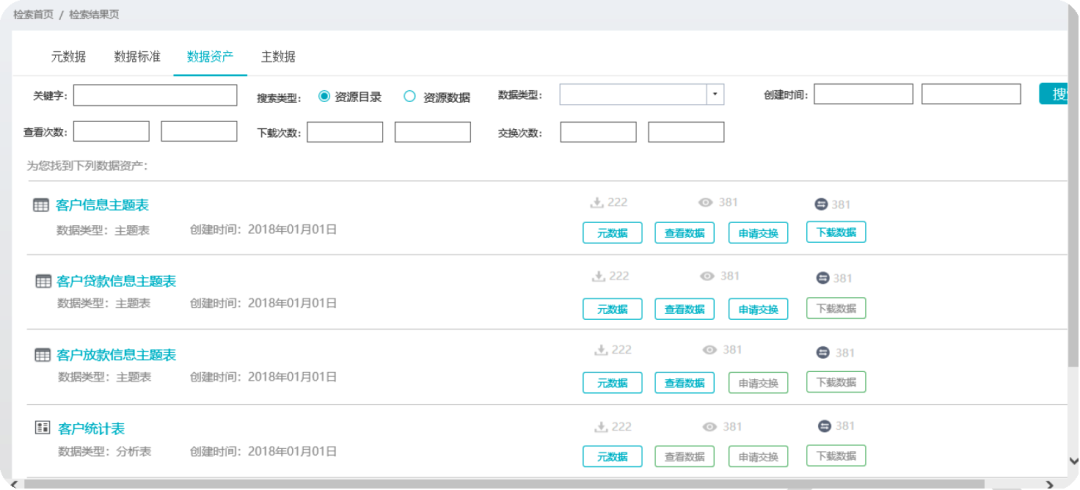 检索条件包括:关键字、搜索类型、查看次数、下载次数、交换次数、创建时间等丰富的检索条件,从而实现数据资产快速查找定位。