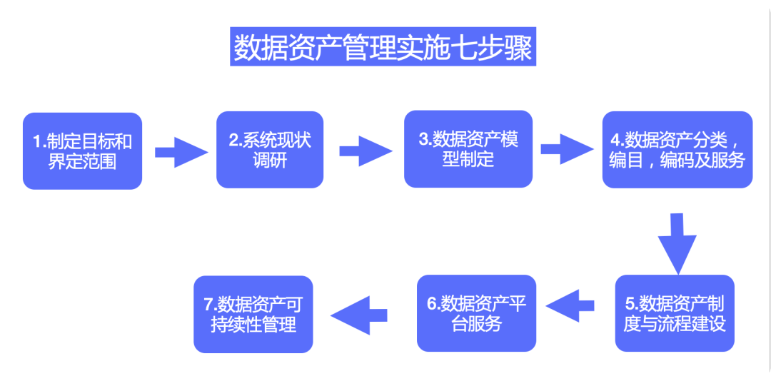数据资产管理这么重要,是企业数字化转型的必经之路,那么组织应该如何实施落地呢?主要有以下7个步骤: