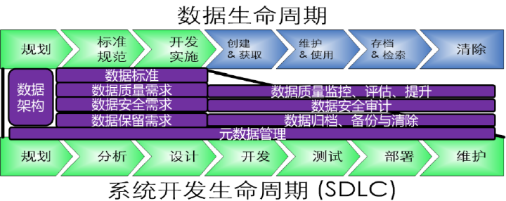 从时间视角上看,企业管理数据资产,就是管理数据的生命周期。数据第一时间被创建或取得,然后存储、维护和使用,最终被销毁。因而有效的数据管理,开始于数据获取之前,企业先期制定数据规划、定义数据规范,以期取得实现数据采集、交付、存储和控制所需的技术能力。