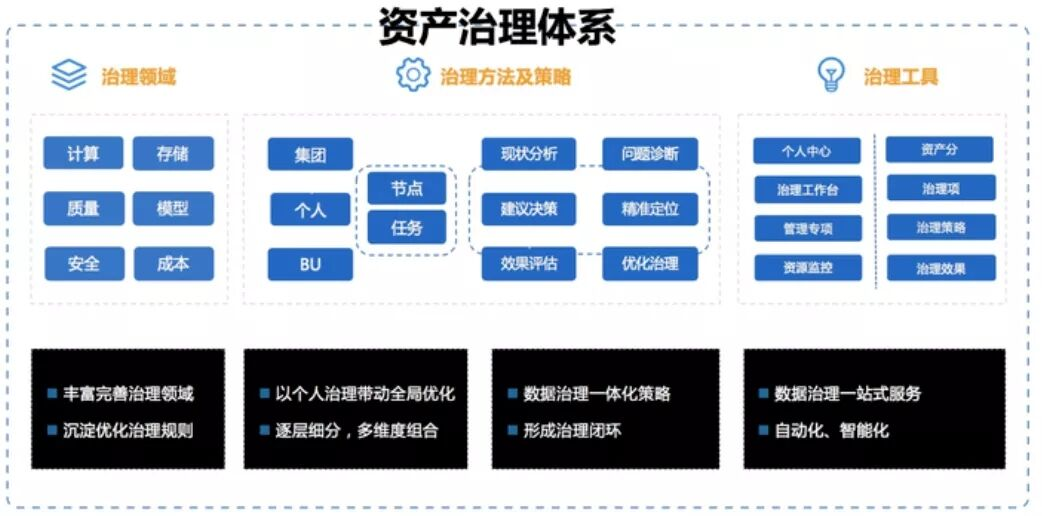 资产治理包括对计算、存储、治理、模型、安全、成本等领域进行治理,并形成有效的智能治理闭环,将治理方法论沉淀为工具产品输出。