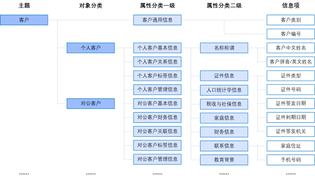 以业务领域构建资产目录为例,可以顺利获得资产盘点,梳理银行数据主题分类/核心业务板块,再根据业务要素逐步向下划分二级目录、三级目录,最后到叶子结点的信息项上。信息项的定义也是从业务出发,梳理业务板块都有哪些数据内容,例如客户信息包括:客户名称、联系方式、地址、证件类型、证件号码等。
