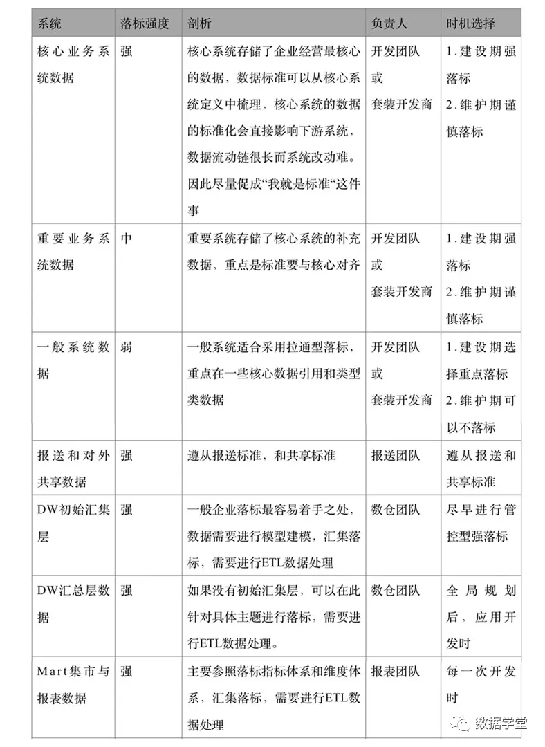 顺利获得这个表格的内容,我们发现数据标准从源头落地,会减少数据的处理成本,提高数据应用的效益,缺点是对于存量系统和外购系统存在较大改动风险和成本。如果从数据的仓库层进行落标,比较容易着手处理,落标后的下游数据系统则自动统一数据标准,然而数仓层的报表应用与业务系统的报表存在口径不一致性在所难免,仍然需要源数据层进行必要调整。