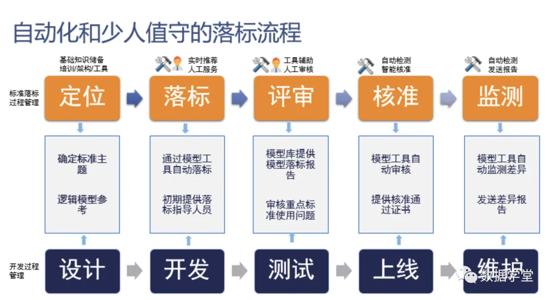 鉴于普通银行当前的数据基础水平,数据的落标同样受到人力和财力的制约。所以一个自动化水平非常高的落标方案是非常切合我国普通银行的开展阶段的。因此,本落标方案的关键思想是在开发阶段由模型设计人员进行落标,标准管理和架构管理人员进行评审和核准,同时,自动检测能力来提高执行水平和激励环节的落地。