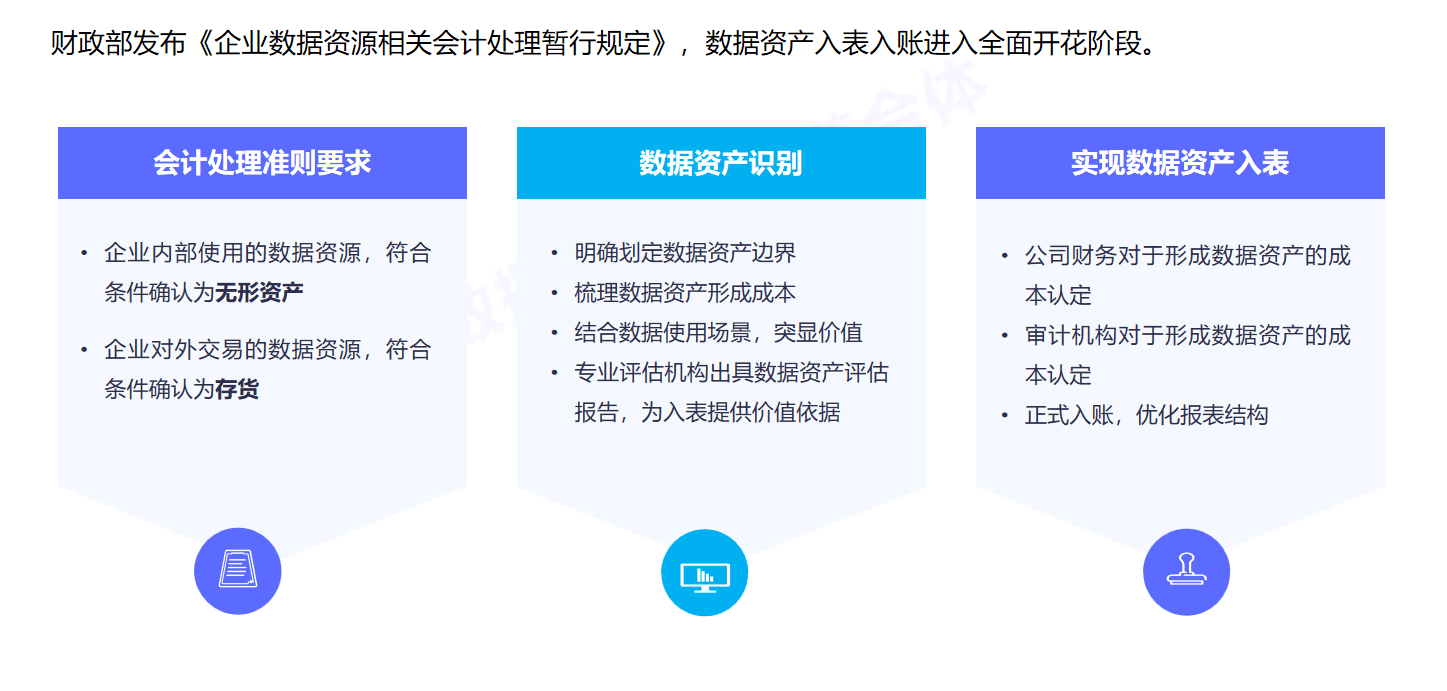 8月21号财政部会计师发布《企业数据资源相关处理的暂行规定》,明确企业使用的数据资源符合条件的可以作为无形资产来确认, 以对外交易为目的用于出售的数据资源可以作为存货来确认。也就是说对于拥有数据资源的业主而言,可以不再把这个数据资产当成一个其他的资产来确认,可以把它作为一个数据资源在财务报表当中体现。