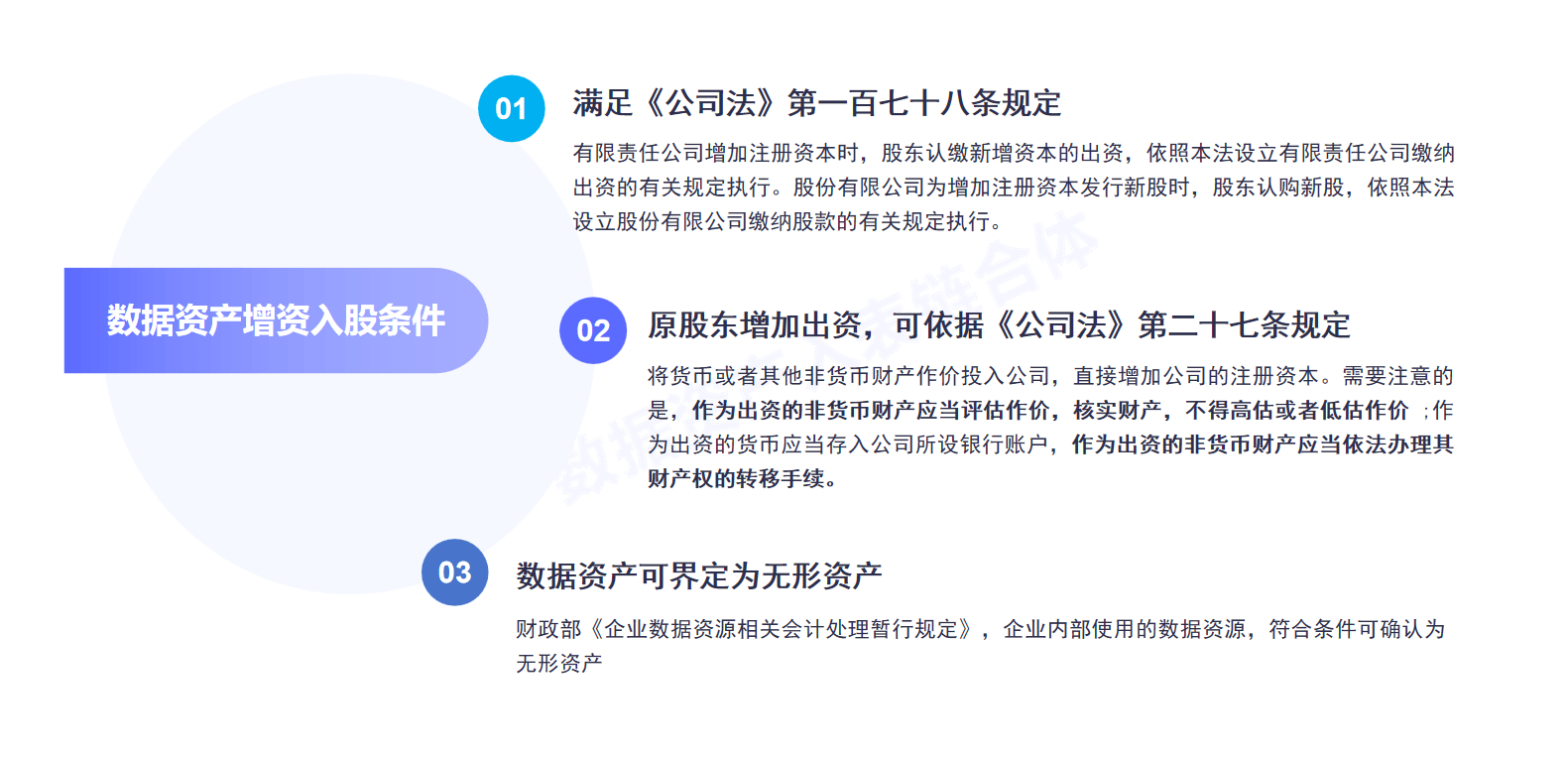 数据资产可以拿当资本金使用,用于出资增资,实现数据入股。自《公司法》修订之后,作为公司出资的资本不再局限于货币资金, 可以以非货币的资产来进行出资。符合一定条件的数据资源已经是数据资产,即使是一个表外资产也具备出资的功能,明年甚至会成为表内资产,也具备出资的功能,因此可以拿数据资产来进行出资。