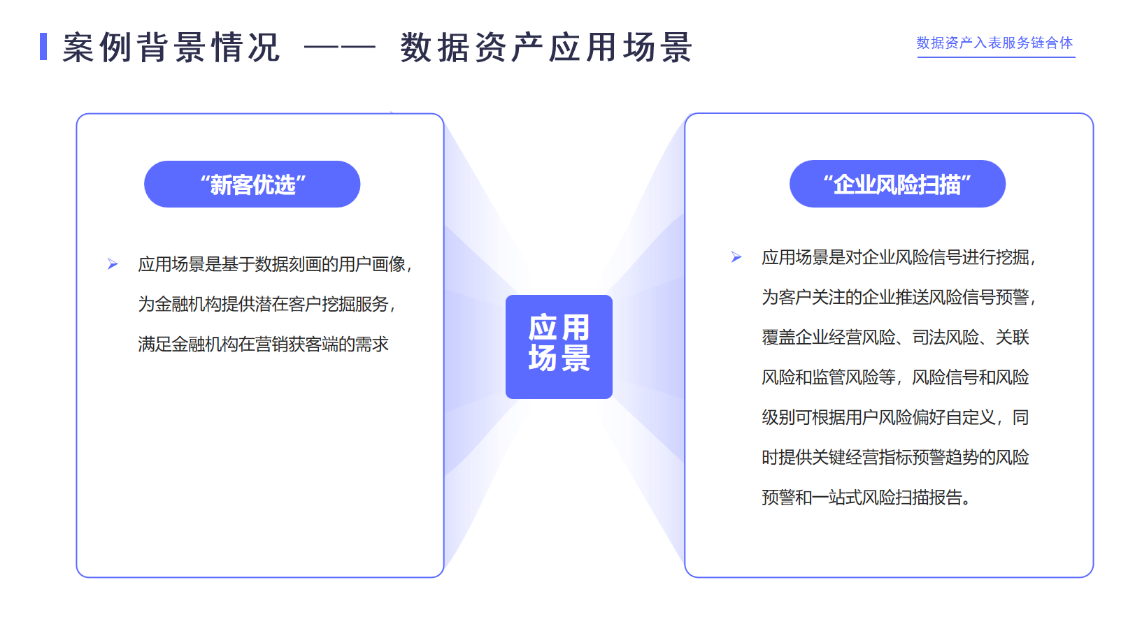 顺利获得分析发现这些有用的信息可以归纳成为两种,一种是持续正面的企业信息,一种是消极负面的企业信息,进行总结和提炼可以衍生出来两个应用场景,并开发了相应的数据产品,一个场景是新客优选,另外一个场景是企业风险扫描。