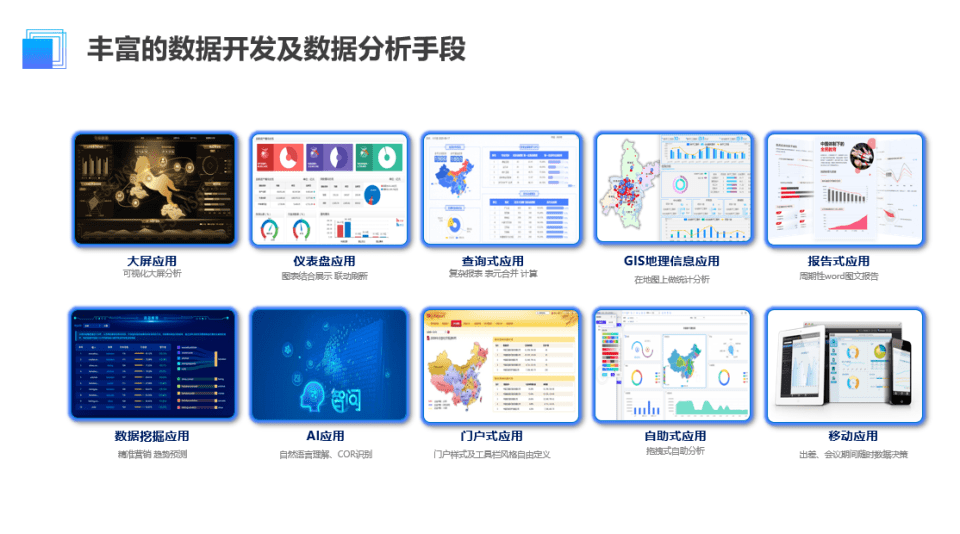 亿信ABI一站式数据分析平台打通从数据接入、到数据建模与处理、再到数据分析与挖掘整个数据应用全链路,可满足企业经营中各类复杂的分析需求,帮助企业实现高效数字化转型。平台分析工具包含报表分析、领导驾驶舱、可视化地图、敏捷看板(面向业务人员,一分钟上手,满足各类用户对业务数据综合分析需要)、分析报告、幻灯片、智能分析语音交互、移动应用 (无缝对接手机端)。