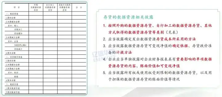 存货的数据资源相关披露需要按照外购的数据资产存货、自行加工的数据资源存货和其他方式取得的数据资源存货等类别进行披露,需要披露数据资源存货成本所采用的方法、计量方法、以及确定依据、计提方法、影响因素。