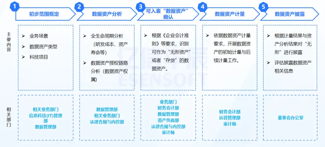 数据治理这件事一样,现在“数据治理”在业内已提高到“公司治理”的范畴,所以数据资产入表同样也一定是企业级自上而下有助于的,需要董事长、高级管理层去有助于。但可以认定某一个部门作为主牵头部门,其他所有部门都要参与进来,而且不只是简单的参与,都要作为数据的核心或者说数据的属主部门一起来有助于。