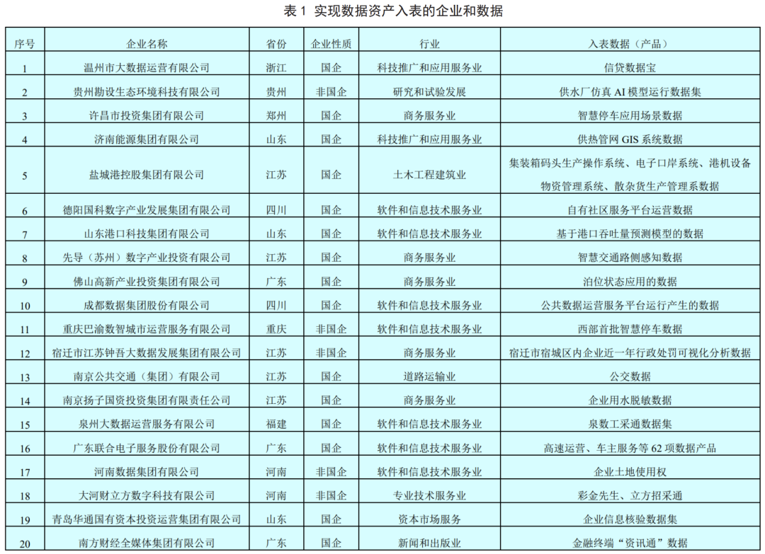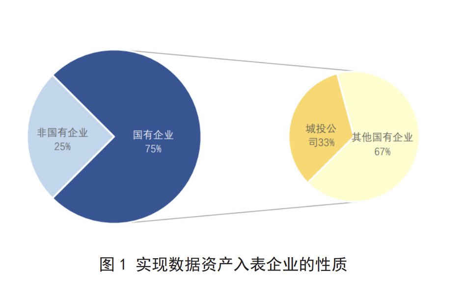 本文选取了截止2024年初实现数据资产入表的20家企业进行统计分析。如表1所示,入表数据多为在公共管理领域中产生的数据。结合涉及数据资产入表企业的性质,我们分析发现,在实现数据资源入表的企业中,非国有企业共有5家,占比25%,国有企业共有15家,占比75%,在这15家国有企业中,城投公司占比超过三成。分析结果表明,由于国有企业,特别是城投公司在日常经营过程中会形成较多的具有公共属性的数据资源,因此更易于识别、整理、评估和计量这些数据,实现数据资源化向数据资产化和数据资本化的转变。
