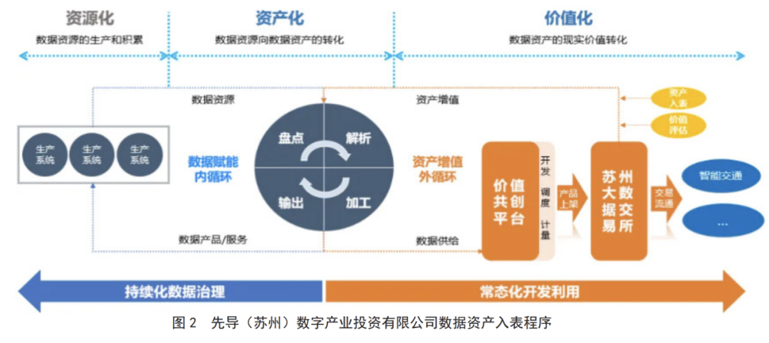 在贵州勘设生态环境科技有限公司实现供水厂仿真AI模型运行数据集入表的案例中,公司顺利获得对数据资源的收集、校核、清洗、筛选、大数据模型驯化等多维度治理,最终形成高质量的数据资源,并对符合《数据资产暂行规定》定义的数据资源进行成本核算,最终实现数据资源的资产化。 在济南能源集团有限公司实现供热管网GIS系统数据入表的案例中,公司顺利获得对热网检测数据的采集、整合、建立模型等数据加工环节,确定数据资产信息属性及价值属性,分析权利类型,完成数据估值及入表等工作。 在山东港口科技集团有限公司实现港口吞吐量数据入表的案例中,公司经过数据梳理、项目立项、数据治理、项目验收、合规审查、资产登记等八个关键环节完成入表。数据资产化的过程逻辑严密,流程严谨,释放了企业数据要素价值。 在先导(苏州)数字产业投资有限公司实现智慧交通路侧感知数据入表的案例中,将入表程序规范化,具体路径如图2所示: