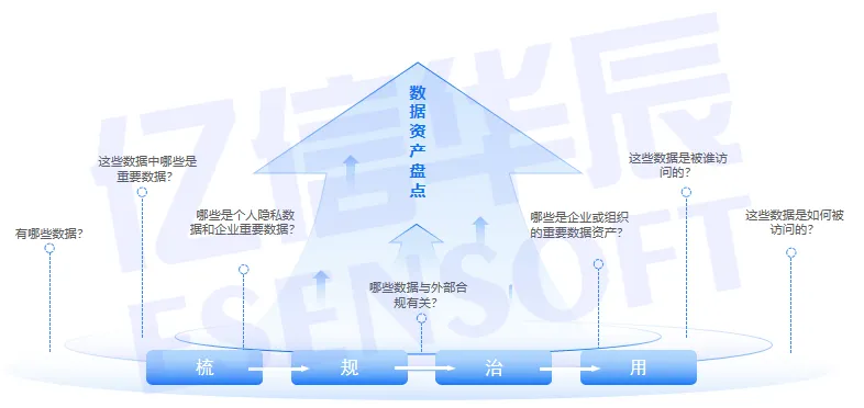 3、盘:盘点资产,层层推进。从业务视角对数据资源进行梳理和规划,从技术视角对系统数据进行盘点,产出数据资产盘点成果物。