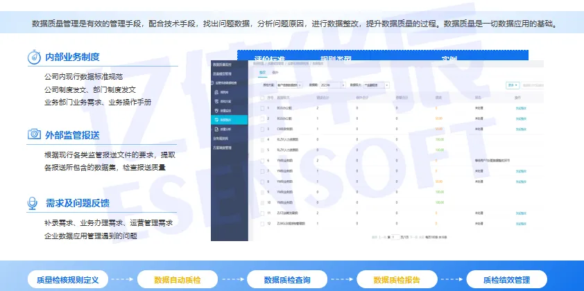 方案帮助金融租赁组织解决在数据资产盘点过程中发现的数据质量问题及场景,并顺利获得数据质量检核工具进行质检,实现一站式数据质检设置、质检执行、质检结果展现追踪、数据整改及绩效评估,高效应对监管要求。