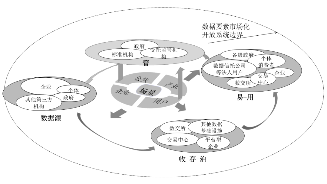 场景驱动数据要素市场化配置既符合场景驱动的内涵特征,又包含数据要素市场化配置的理论实践,其核心在于以“公共—产业—企业—用户”等不同维度场景下数据要素市场化配置的重点和痛点为抓手,由数据源出方、数据“收—存—治—易—用”的各个主体共同构成数据要素市场化配置的生态底座,由数据监管主体发挥顶层设计与监管功能,保障数据要素安全交易,顺畅流通。其中,政府、企业、个人等作为数据源供给海量数据;数据交易所、企业、数据交易中心等在“收—存—治”阶段发挥主要作用,共同将数据激活,转变为知识状态;数据交易所、企业、各级政府、个人等结合场景需求与痛点参与数据的交易和使用过程,充分激活数据的场景价值;政府、标准组织、受托监管组织等在此过程中承担监管职能,保障数据交易流通。顺利获得多元主体的生态价值共创精准打通数据要素市场化配置“收—存—治—易—用—管”的各个核心环节,最终实现生态价值共创。