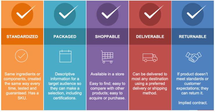 现实世界中的大多数产品都在数字商店或实体店中找到。商店是顾客购物和卖家与顾客联系的连接点,消除了买卖之间的摩擦。在到达商店之前,产品只是资产或库存。一旦进入商店,产品就具有促进购物过程的某些特征:它们是标准化的、包装好的、可购买的、可交付的和可退货的。(见图1)。
