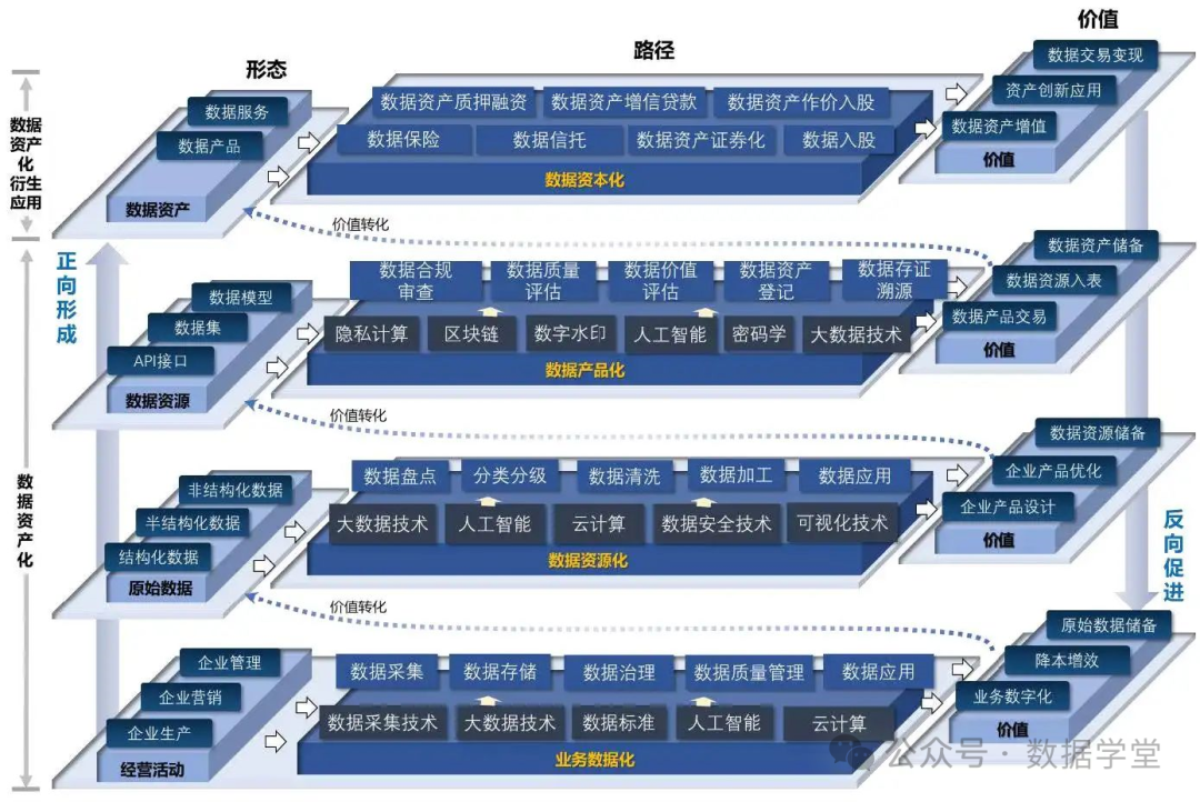 数据资产化是实现数据价值转化的核心途径,是企业将过去交易或经合法授权、自主生产等事项形成、取得的数据顺利获得采集、加工、治理、开发等环节转化为可计量、可交易的数据资产,并拓展金融衍生服务,有助于数据资产创新应用,顺利获得多元化方式为企业带来经济利益,实现数据价值最大化的过程。