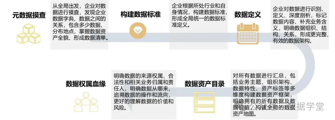 元数据是定义和描述其他数据的数据,贯穿在数据资产管理的全流程中,是支撑数据资产化的核心。主要内容包括: