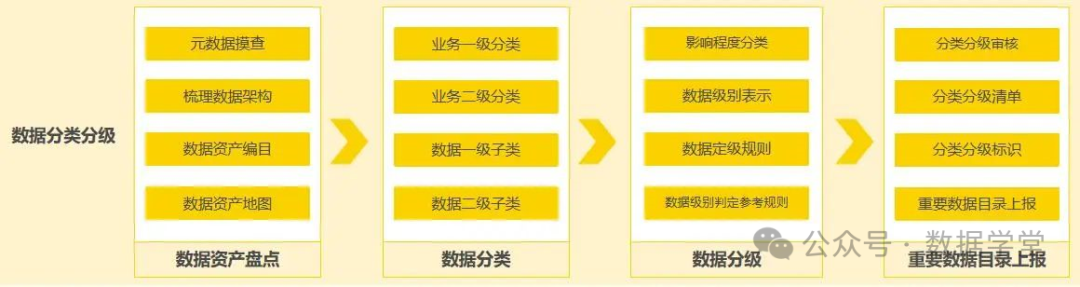 ①确定分级对象,如数据项、数据集、延伸数据、跨行业领域数据等;