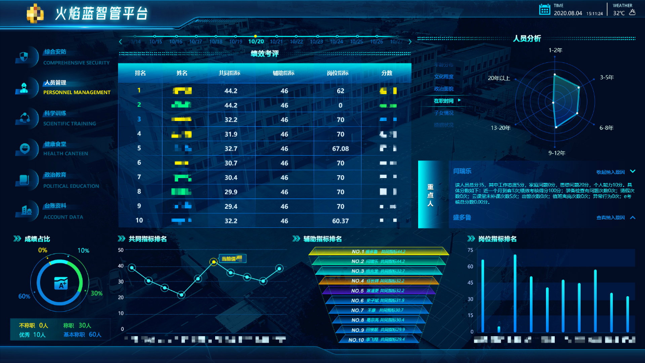 根据企业的分析展示诉求,结合数据调研情况,紧扣消防救援业务,以管人、定物、抓事、谋战为主要抓手设置了六大维度的工作场景,选取所需展示的数据指标,实现炫酷可视化展示。让管理者能够清晰分析消防救援站基本情况以及消防救援队员、队站、食堂、训练等管理情况。顺利获得该平台的构建,为实行消防救援队伍信息展示、决策分析、考评公正、减压释负、服务实战等应用工作给予支撑。